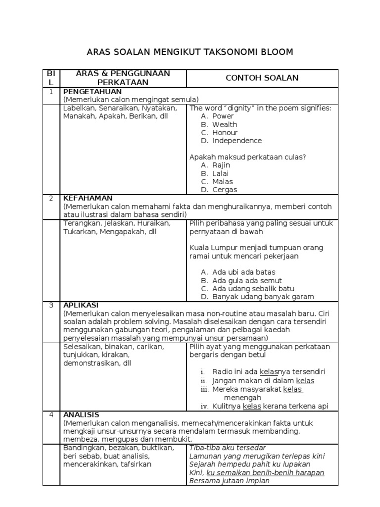 Aras Soalan Mengikut Taksonomi Bloom Pdf