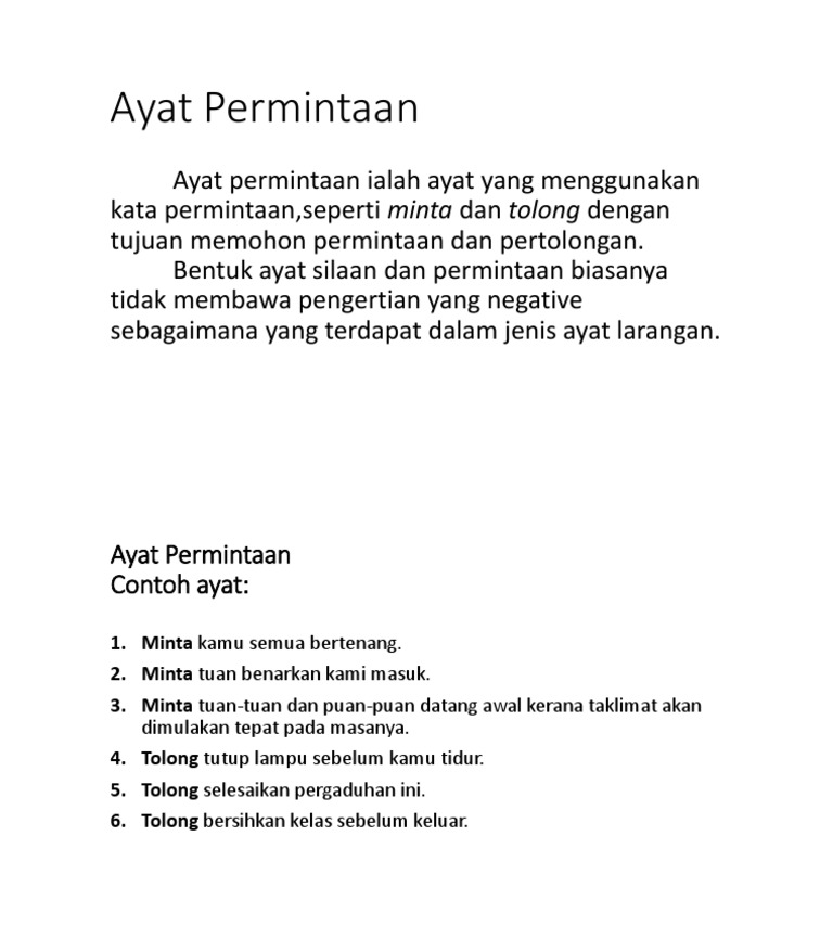 Ayat Permintaan Ayat permintaan ialah ayat yang menggunakan kata-kata permintaan seperti minta atau tolong dengan maksud memohon bantuan atau meminta sesuatu. Imbuhan pinjaman koleksi nota nota. Contoh ayat ialah anak sulaiman pandai menyanyi jenis ayat pasif.